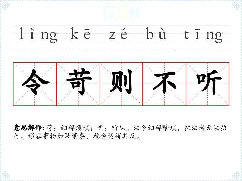 | 令苛则不听 | 苛:细碎烦琐;听:听从。法令细碎繁琐,执法者无法执行。形容事物如果繁杂,就会适得其反。 |