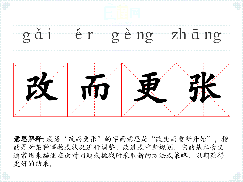 成语“改而更张”的字面意思是“改变而重新开始”,指的是对某种事物或状况进行调整、改进或重新规划。它的基本含义通常用来描述在面对问题或挑战时采取新的方法或策略,以期获得更好的结果。