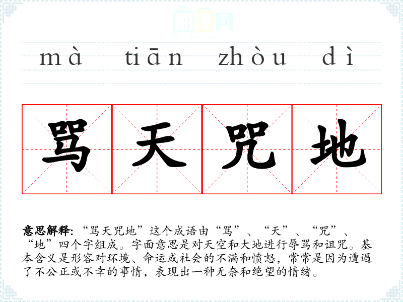 “骂天咒地”这个成语由“骂”、“天”、“咒”、“地”四个字组成。字面意思是对天空和大地进行辱骂和诅咒。基本含义是形容对环境、命运或社会的不满和愤怒,常常是因为遭遇了不公正或不幸的事情,表现出一种无奈和绝望的情绪。