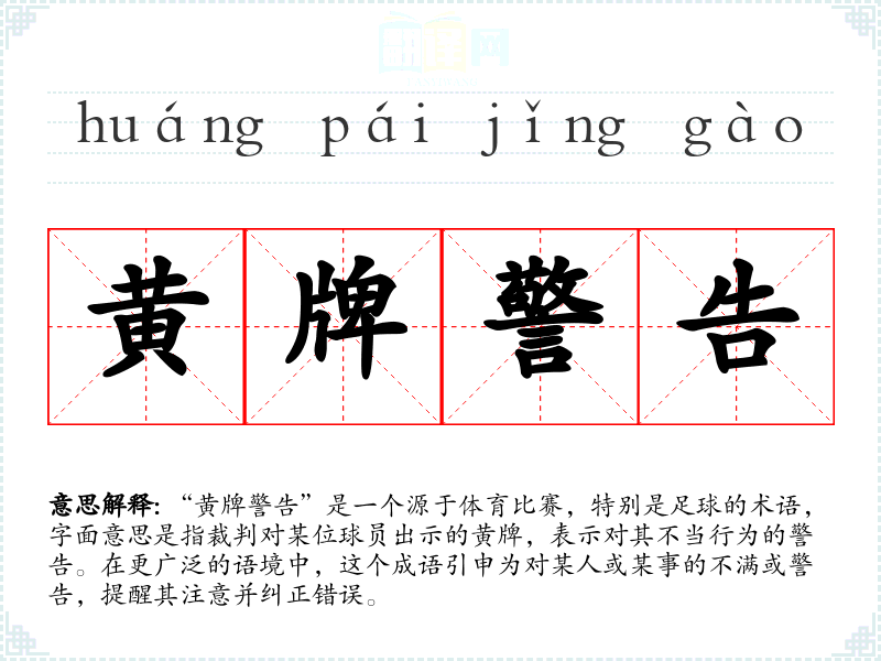 “黄牌警告”是一个源于体育比赛,特别是足球的术语,字面意思是指裁判对某位球员出示的黄牌,表示对其不当行为的警告。在更广泛的语境中,这个成语引申为对某人或某事的不满或警告,提醒其注意并纠正错误。