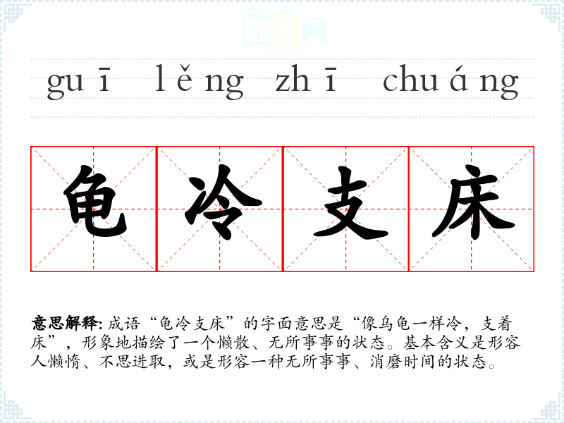 成语“龟冷支床”的字面意思是“像乌龟一样冷,支着床”,形象地描绘了一个懒散、无所事事的状态。基本含义是形容人懒惰、不思进取,或是形容一种无所事事、消磨时间的状态。