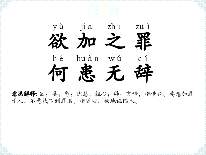 欲:要;患:忧愁,担心;辞:言辞,指借口。要想加罪于人,不愁找不到罪名。指随心所欲地诬陷人。 |