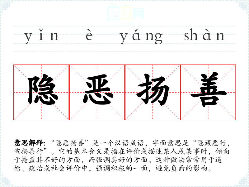 “隐恶扬善”是一个汉语成语,字面意思是“隐藏恶行,宣扬善行”。它的基本含义是指在评价或描述某人或某事时,倾向于掩盖其不好的方面,而强调其好的方面。这种做法常常用于道德、政治或社会评价中,强调积极的一面,避免负面的影响。