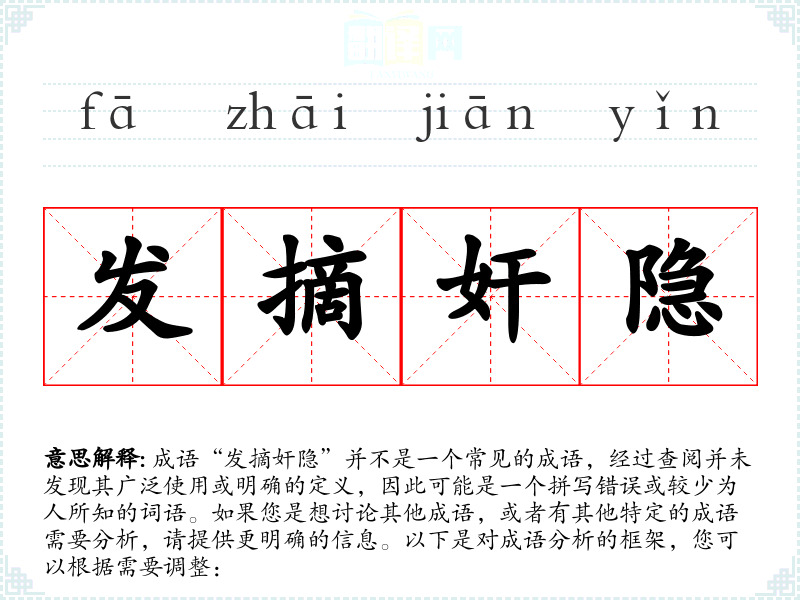 成语“发摘奸隐”并不是一个常见的成语,经过查阅并未发现其广泛使用或明确的定义,因此可能是一个拼写错误或较少为人所知的词语。如果您是想讨论其他成语,或者有其他特定的成语需要分析,请提供更明确的信息。以下是对成语分析的框架,您可以根据需要调整: