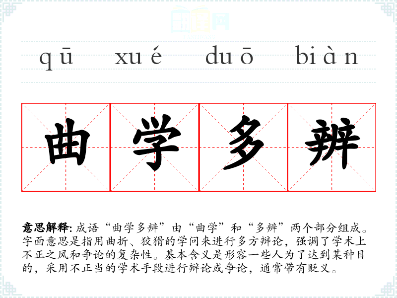 成语“曲学多辨”由“曲学”和“多辨”两个部分组成。字面意思是指用曲折、狡猾的学问来进行多方辩论,强调了学术上不正之风和争论的复杂性。基本含义是形容一些人为了达到某种目的,采用不正当的学术手段进行辩论或争论,通常带有贬义。