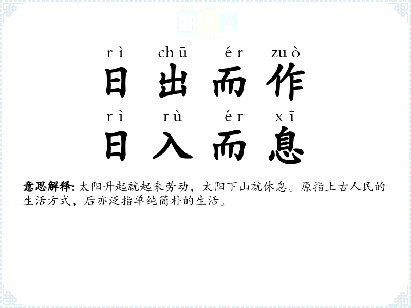 | 出作入息 | 太阳一出来就开始工作,太阳落山就休息。指日常生活。 |