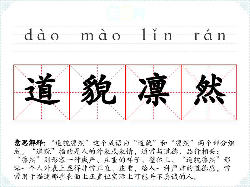 “道貌凛然”这个成语由“道貌”和“凛然”两个部分组成。“道貌”指的是人的外表或表情,通常与道德、品行相关;“凛然”则形容一种威严、庄重的样子。整体上,“道貌凛然”形容一个人外表上显得非常正直、庄重,给人一种严肃的道德感,常常用于描述那些表面上正直但实际上可能并不真诚的人。