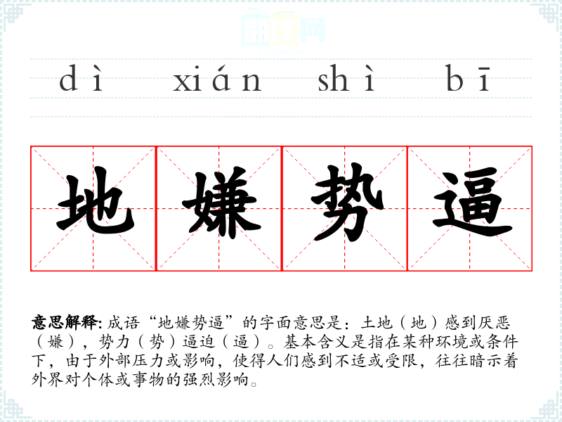 成语“地嫌势逼”的字面意思是:土地(地)感到厌恶(嫌),势力(势)逼迫(逼)。基本含义是指在某种环境或条件下,由于外部压力或影响,使得人们感到不适或受限,往往暗示着外界对个体或事物的强烈影响。