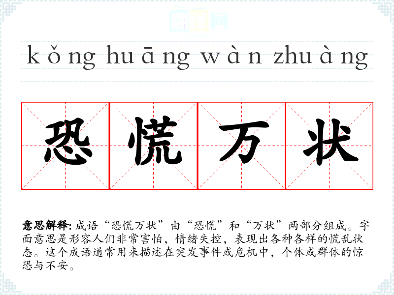 成语“恐慌万状”由“恐慌”和“万状”两部分组成。字面意思是形容人们非常害怕,情绪失控,表现出各种各样的慌乱状态。这个成语通常用来描述在突发**或危机中,个体或群体的惊恐与不安。
