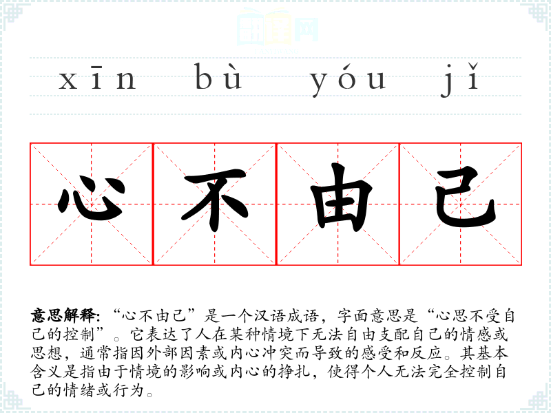 “心不由己”是一个汉语成语,字面意思是“心思不受自己的控制”。它表达了人在某种情境下无法自由支配自己的情感或思想,通常指因外部因素或内心冲突而导致的感受和反应。其基本含义是指由于情境的影响或内心的挣扎,使得个人无法完全控制自己的情绪或行为。