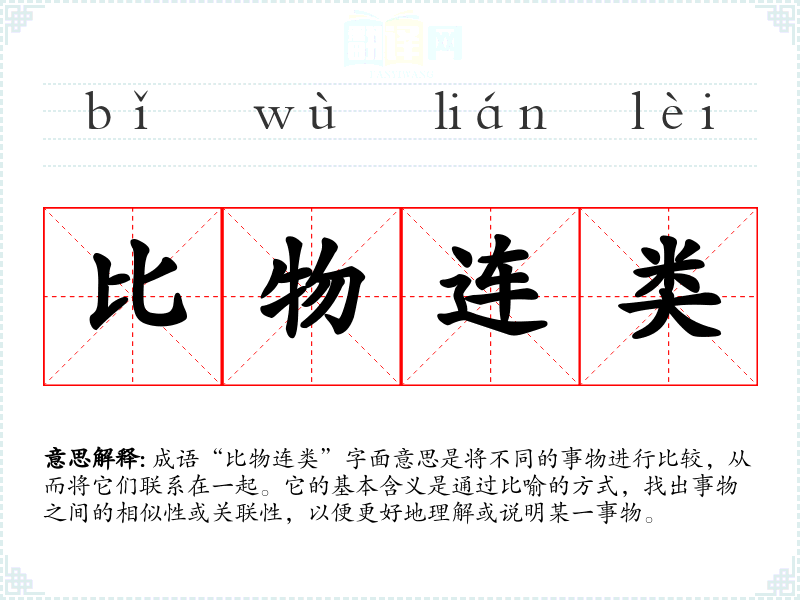 成语“比物连类”字面意思是将不同的事物进行比较,从而将它们联系在一起。它的基本含义是通过比喻的方式,找出事物之间的相似性或关联性,以便更好地理解或说明某一事物。