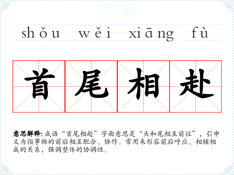 成语“首尾相赴”字面意思是“头和尾相互前往”,引申义为指事物的前后相互配合、协作。常用来形容前后呼应、相辅相成的关系,强调整体的协调性。