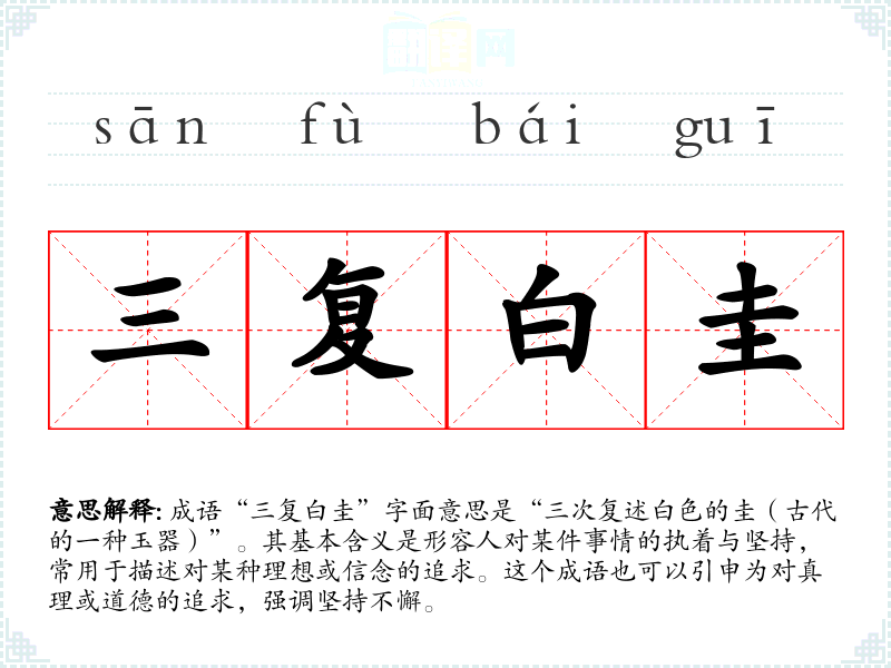 成语“三复白圭”字面意思是“三次复述白色的圭(古代的一种玉器)”。其基本含义是形容人对某件事情的执着与坚持,常用于描述对某种理想或信念的追求。这个成语也可以引申为对真理或道德的追求,强调坚持不懈。