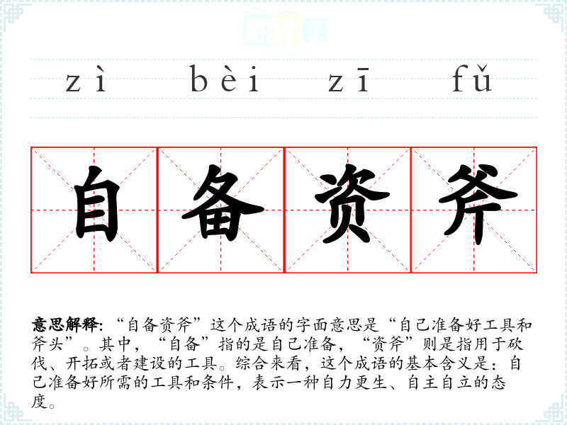 “自备资斧”这个成语的字面意思是“自己准备好工具和斧头”。其中,“自备”指的是自己准备,“资斧”则是指用于砍伐、开拓或者建设的工具。综合来看,这个成语的基本含义是:自己准备好所需的工具和条件,表示一种自力更生、自主自立的态度。