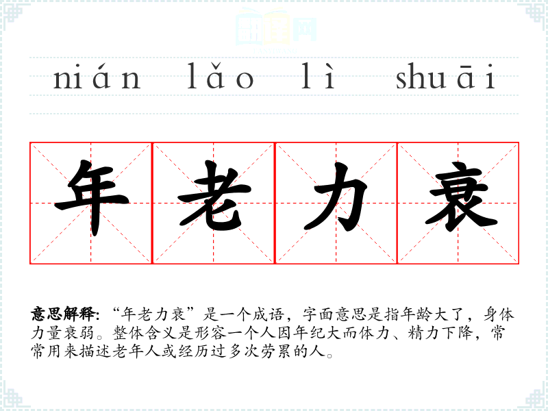“年老力衰”是一个成语,字面意思是指年龄大了,身体力量衰弱。整体含义是形容一个人因年纪大而体力、精力下降,常常用来描述老年人或经历过多次劳累的人。