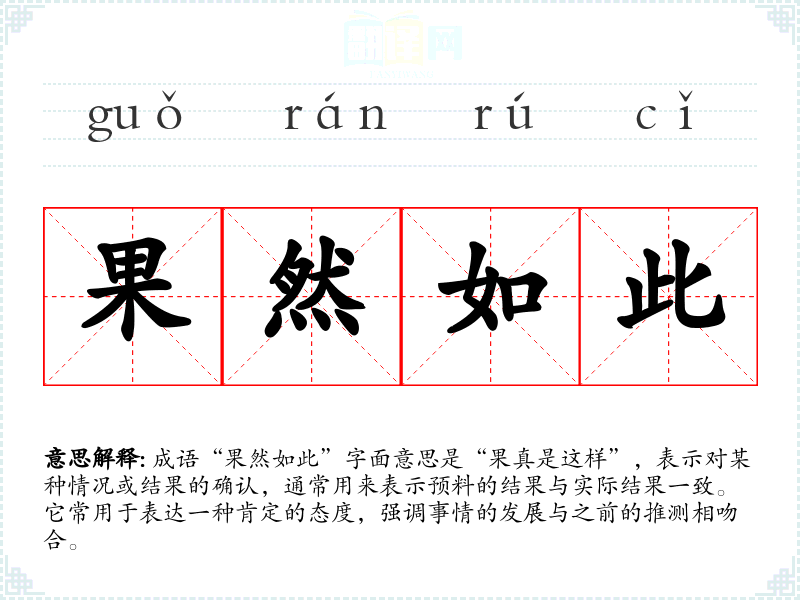 成语“果然如此”字面意思是“果真是这样”,表示对某种情况或结果的确认,通常用来表示预料的结果与实际结果一致。它常用于表达一种肯定的态度,强调事情的发展与之前的推测相吻合。