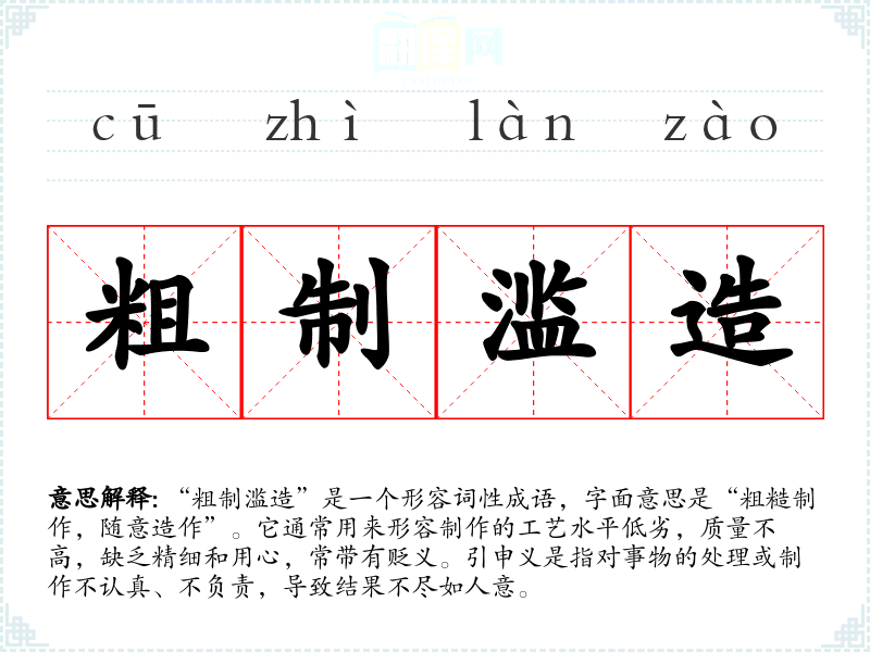 “粗制滥造”是一个形容词性成语,字面意思是“粗糙制作,随意造作”。它通常用来形容制作的工艺水平低劣,质量不高,缺乏精细和用心,常带有贬义。引申义是指对事物的处理或制作不认真、不负责,导致结果不尽如人意。