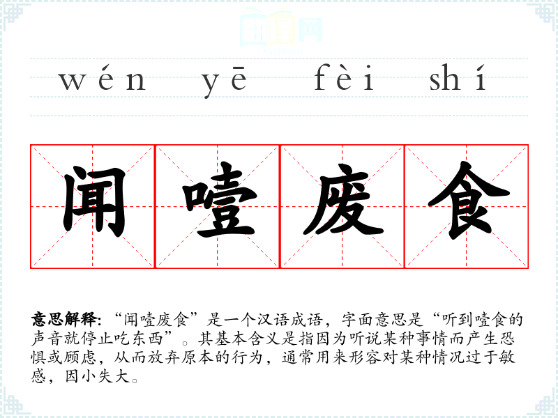“闻噎废食”是一个汉语成语,字面意思是“听到噎食的声音就停止吃东西”。其基本含义是指因为听说某种事情而产生恐惧或顾虑,从而放弃原本的行为,通常用来形容对某种情况过于敏感,因小失大。