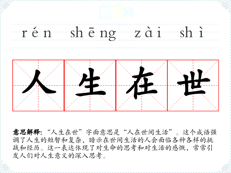“人生在世”字面意思是“人在世间生活”。这个成语强调了人生的短暂和复杂,暗示在世间生活的人会面临各种各样的挑战和经历。这一表达体现了对生命的思考和对生活的感慨,常常引发人们对人生意义的深入思考。