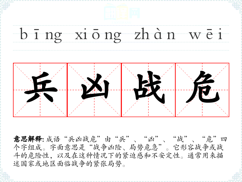 成语“兵凶战危”由“兵”、“凶”、“战”、“危”四个字组成。字面意思是“战争凶险、局势危急”。它形容战争或战斗的危险性,以及在这种情况下的紧迫感和不安定性。通常用来描述国家或地区面临战争的紧张局势。