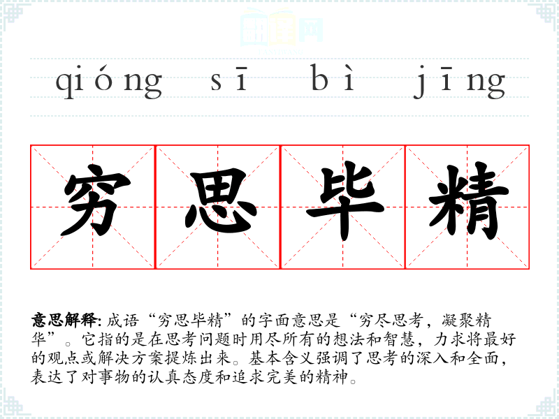 成语“穷思毕精”的字面意思是“穷尽思考,凝聚精华”。它指的是在思考问题时用尽所有的想法和智慧,力求将最好的观点或解决方案提炼出来。基本含义强调了思考的深入和全面,表达了对事物的认真态度和追求完美的精神。