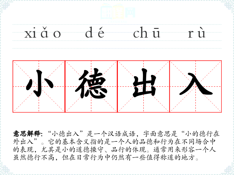 “小德出入”是一个汉语成语,字面意思是“小的德行在外出入”。它的基本含义指的是一个人的品德和行为在不同场合中的表现,尤其是小的道德操守、品行的体现。通常用来形容一个人虽然德行不高,但在日常行为中仍然有一些值得称道的地方。