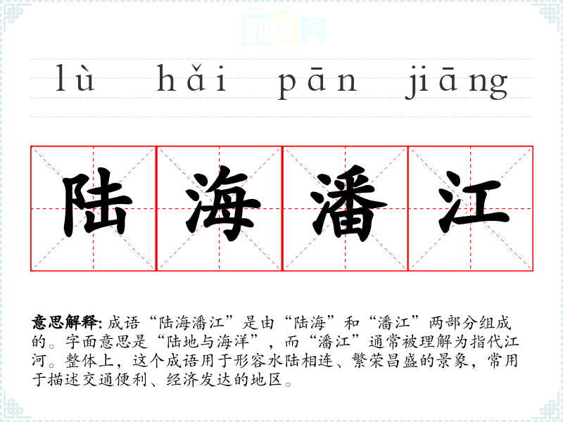 成语“陆海潘江”是由“陆海”和“潘江”两部分组成的。字面意思是“陆地与海洋”,而“潘江”通常被理解为指代江河。整体上,这个成语用于形容水陆相连、繁荣昌盛的景象,常用于描述交通便利、经济发达的地区。