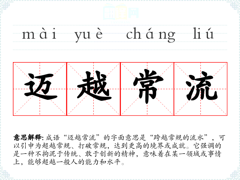 成语“迈越常流”的字面意思是“跨越常规的流水”,可以引申为超越常规、打破常规,达到更高的境界或成就。它强调的是一种不拘泥于传统、敢于创新的精神,意味着在某一领域或事情上,能够超越一般人的能力和水平。