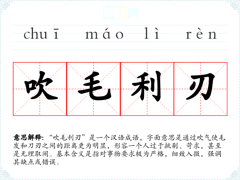 “吹毛利刃”是一个汉语成语,字面意思是通过吹气使毛发和刀刃之间的距离更为明显,形容一个人过于挑剔、苛求,甚至是无理取闹。基本含义是指对事物要求极为严格,细致入微,强调其缺点或错误。