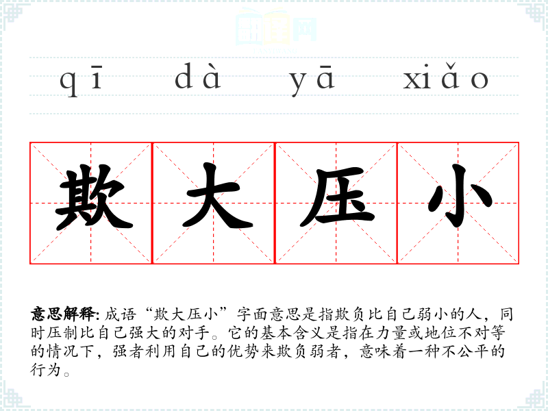 通过对“欺大压小”的分析,我更加意识到社会中不平等现象的普遍性及其对人心的影响。这个成语提醒我在生活中保持对弱者的同情与理解,并在表达中努力维护公平正义。