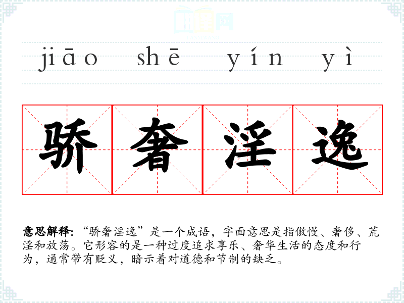“骄奢淫逸”是一个成语,字面意思是指傲慢、奢侈、荒淫和放荡。它形容的是一种过度追求享乐、奢华生活的态度和行为,通常带有贬义,暗示着对道德和节制的缺乏。