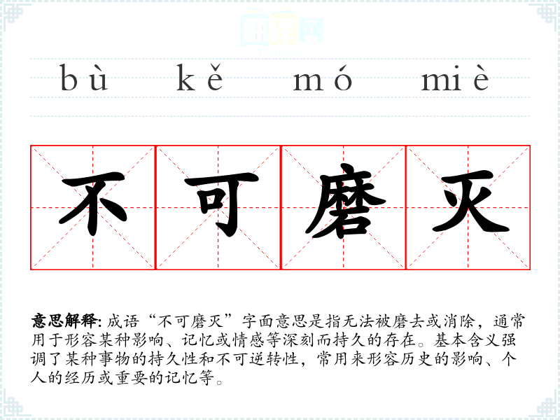 成语“不可磨灭”字面意思是指无法被磨去或消除,通常用于形容某种影响、记忆或情感等深刻而持久的存在。基本含义强调了某种事物的持久性和不可逆转性,常用来形容历史的影响、个人的经历或重要的记忆等。
