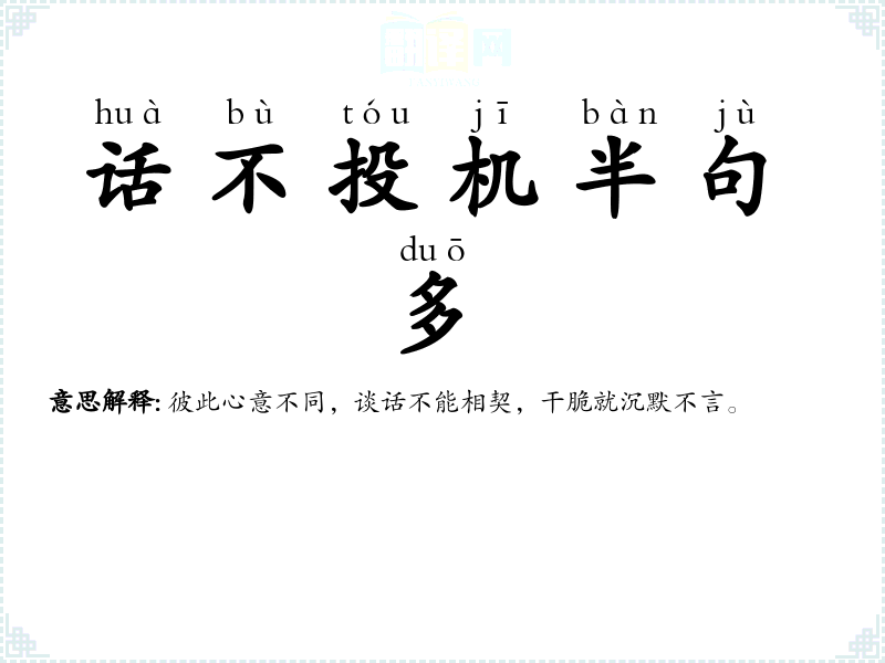 | 话不投机半句多 | 彼此心意不同,谈话不能相契,干脆就沉默不言。 |
