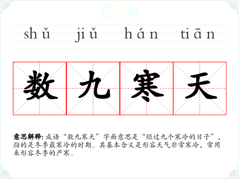 成语“数九寒天”字面意思是“经过九个寒冷的日子”,指的是冬季最寒冷的时期。其基本含义是形容天气非常寒冷,常用来形容冬季的严寒。