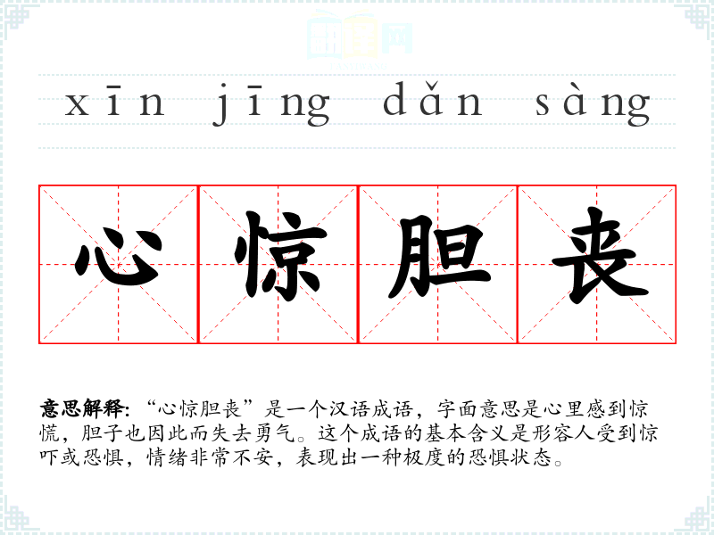 - 反义成语:泰然自若、从容不迫。这些成语表示内心的镇定与安宁,与“心惊胆丧”的情绪完全相反。