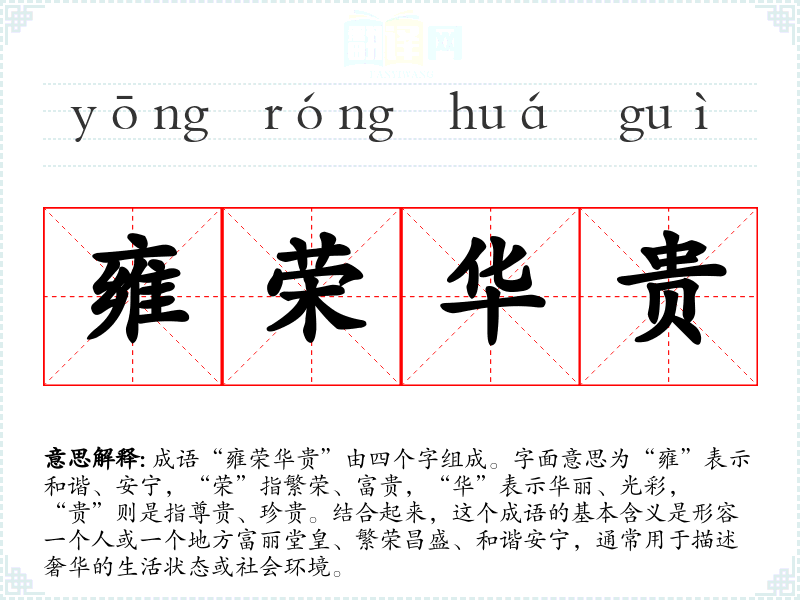 成语“雍荣华贵”由四个字组成。字面意思为“雍”表示和谐、安宁,“荣”指繁荣、富贵,“华”表示华丽、光彩,“贵”则是指尊贵、珍贵。结合起来,这个成语的基本含义是形容一个人或一个地方富丽堂皇、繁荣昌盛、和谐安宁,通常用于描述奢华的生活状态或社会环境。