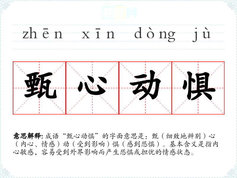 成语“甄心动惧”的字面意思是:甄(细致地辨别)心(内心、情感)动(受到影响)惧(感到恐惧)。基本含义是指内心敏感,容易受到外界影响而产生恐惧或担忧的情感状态。