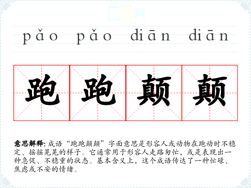 成语“跑跑颠颠”字面意思是形容人或动物在跑动时不稳定、摇摇晃晃的样子。它通常用于形容人走路匆忙,或是表现出一种急促、不稳重的状态。基本含义上,这个成语传达了一种忙碌、焦虑或不安的情绪。