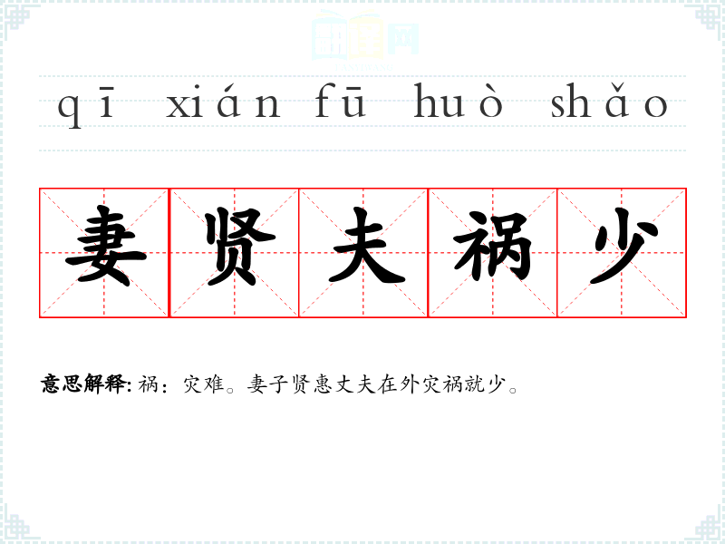 | 妻贤夫祸少 | 祸:灾难。妻子贤惠丈夫在外灾祸就少。 |