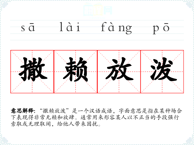 “撒赖放泼”是一个汉语成语,字面意思是指在某种场合下表现得非常无赖和放肆。通常用来形容某人以不正当的手段强行索取或无理取闹,给他人带来困扰。