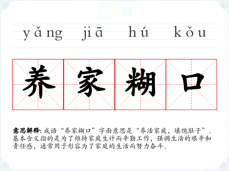| 养家糊口 | 指勉强养活家人,使不饿肚。 |