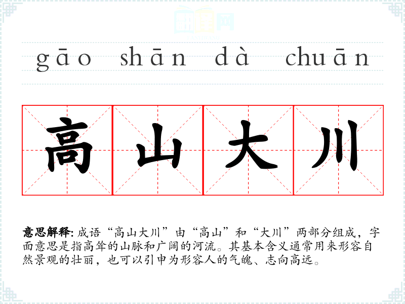 成语“高山大川”由“高山”和“大川”两部分组成,字面意思是指高耸的山脉和广阔的河流。其基本含义通常用来形容自然景观的壮丽,也可以引申为形容人的气魄、志向高远。