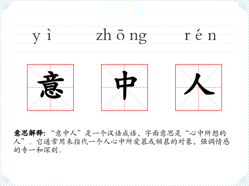 “意中人”是一个汉语成语,字面意思是“心中所想的人”。它通常用来指代一个人心中所爱慕或倾慕的对象,强调情感的专一和深刻。