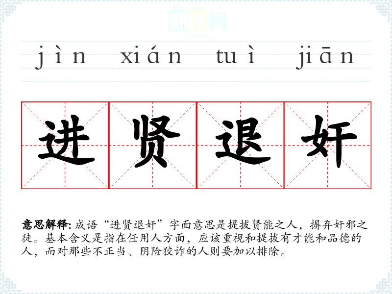 成语“进贤退奸”字面意思是提拔贤能之人,摒弃奸邪之徒。基本含义是指在任用人方面,应该重视和提拔有才能和品德的人,而对那些不正当、阴险狡诈的人则要加以排除。