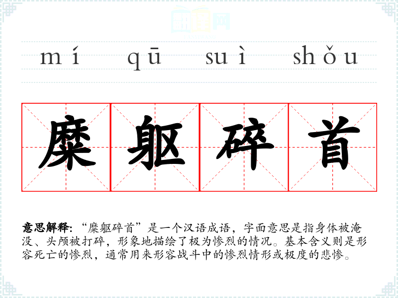 “糜躯碎首”是一个汉语成语,字面意思是指身体被淹没、头颅被打碎,形象地描绘了极为惨烈的情况。基本含义则是形容死亡的惨烈,通常用来形容战斗中的惨烈情形或极度的悲惨。