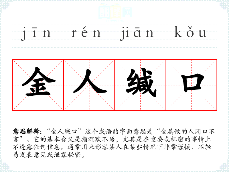 “金人缄口”这个成语的字面意思是“金属做的人闭口不言”。它的基本含义是指沉默不语,尤其是在重要或机密的事情上不透露任何信息。通常用来形容某人在某些情况下非常谨慎,不轻易发表意见或泄露秘密。