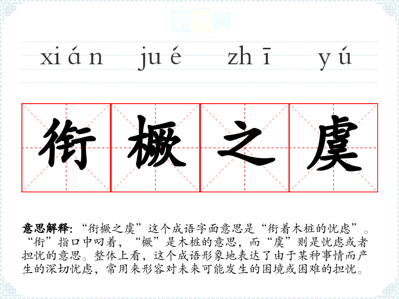 “衔橛之虞”这个成语字面意思是“衔着木桩的忧虑”。“衔”指口中叼着,“橛”是木桩的意思,而“虞”则是忧虑或者担忧的意思。整体上看,这个成语形象地表达了由于某种事情而产生的深切忧虑,常用来形容对未来可能发生的困境或困难的担忧。