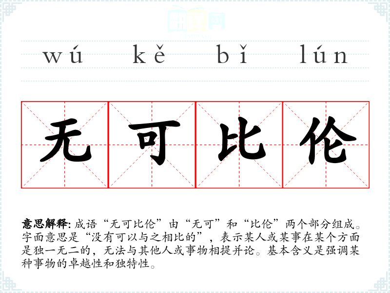 成语“无可比伦”由“无可”和“比伦”两个部分组成。字面意思是“没有可以与之相比的”,表示某人或某事在某个方面是独一无二的,无法与其他人或事物相提并论。基本含义是强调某种事物的卓越性和独特性。