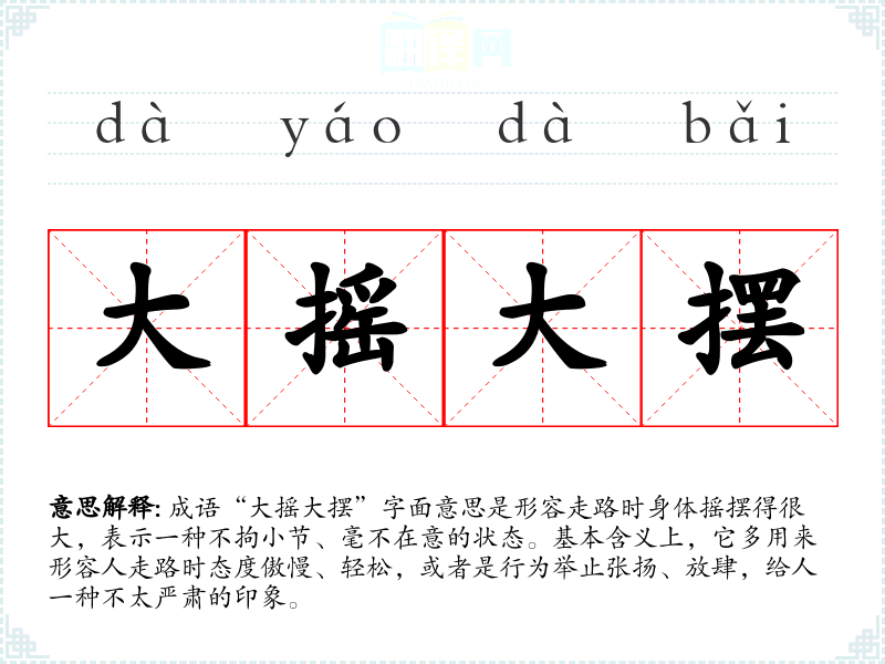 - 文学作品:在描述人物性格时,可以用“大摇大摆”来表现角色的张扬和自信。