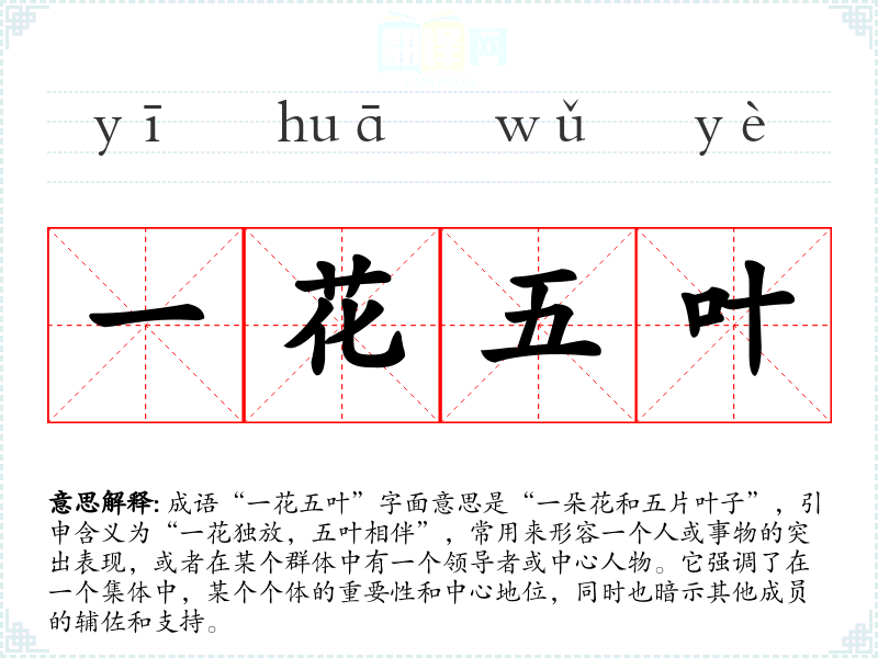 成语“一花五叶”字面意思是“一朵花和五片叶子”,引申含义为“一花独放,五叶相伴”,常用来形容一个人或事物的突出表现,或者在某个群体中有一个领导者或中心人物。它强调了在一个集体中,某个个体的重要性和中心地位,同时也暗示其他成员的辅佐和支持。
